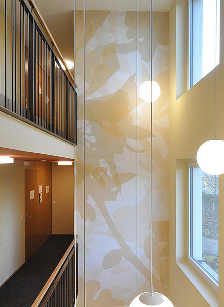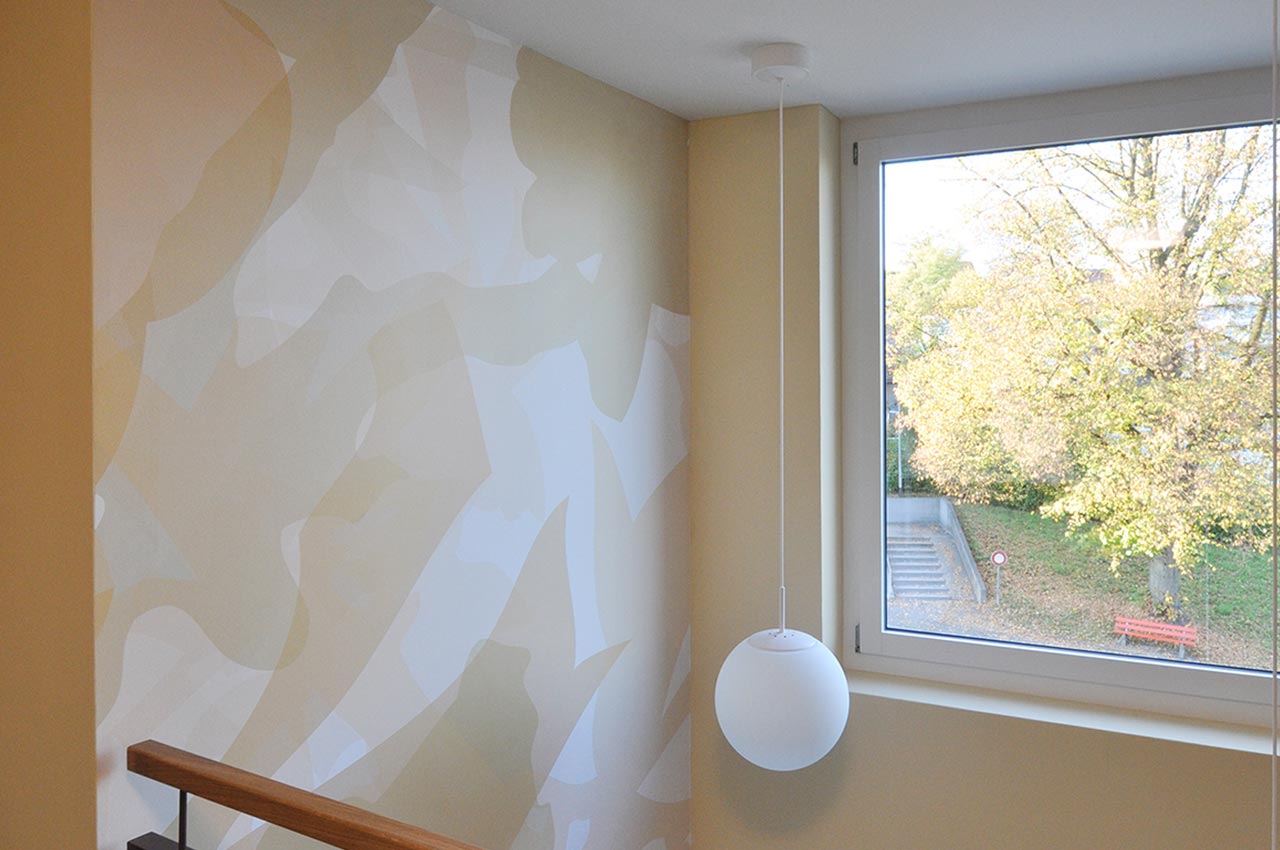 Die Farbgebung der grob verputzten Gebäudehüllen invertiert sich, im Inneren charakterisieren grossflächige Wandgrafiken und farbige Deckenuntersichten die Erschliessungszonen.