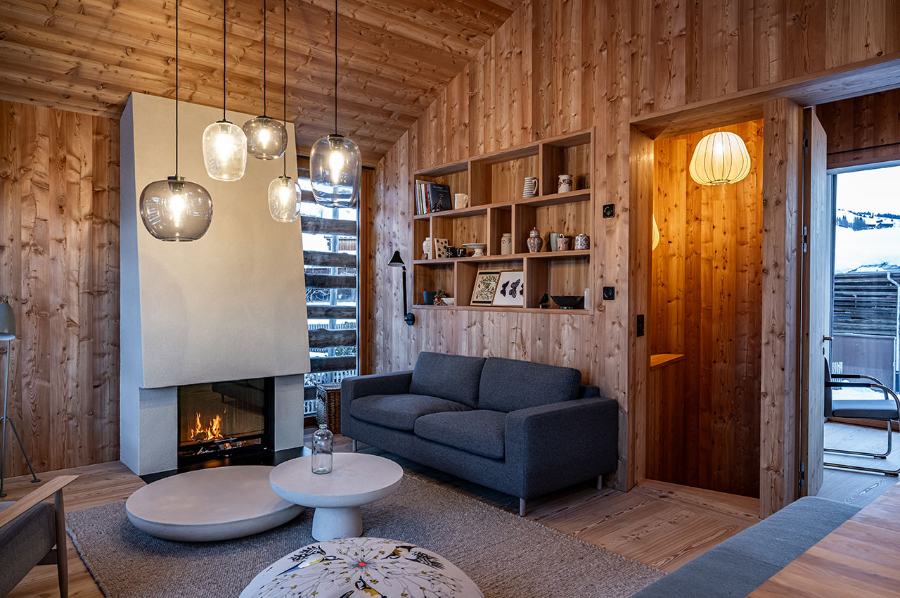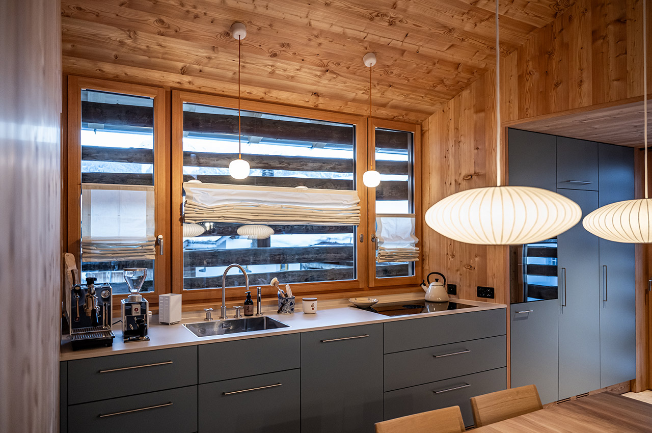 Besonderes Augenmerk lag auf der Raumstimmung, ein hoher Wohlfühl-Charakter war eines der Ziele. Als Ergänzung zu dem, mit einheimischem Lärchenholz erfolgtem Innenausbau, wurden gezielt farbliche Akzente gesetzt. Beispielsweise wurde im Erdgeschoss ein smaragdgrüner Betonboden eingebracht, im Obergeschoss erhielten die Küchenfronten eine Lackierung in "Gustavianischem Blau".