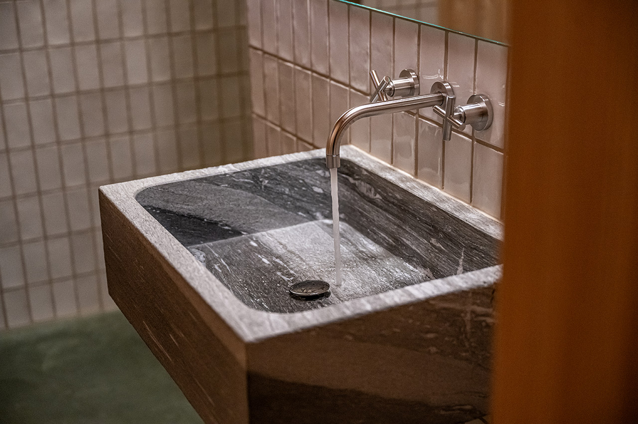 Besonders stimmungsvoll sind die archaischen Valserstein-Waschbecken, die bronzefarbenen Armaturen, die kreidefarbenen Fliesen mit handwerklichem Charakter und die Vorhänge aus mauvefarbenem Wollstoff. Ein abgestimmtes Beleuchtungs- und Möbelkonzept vervollständigt das gesamte Raumambiente.