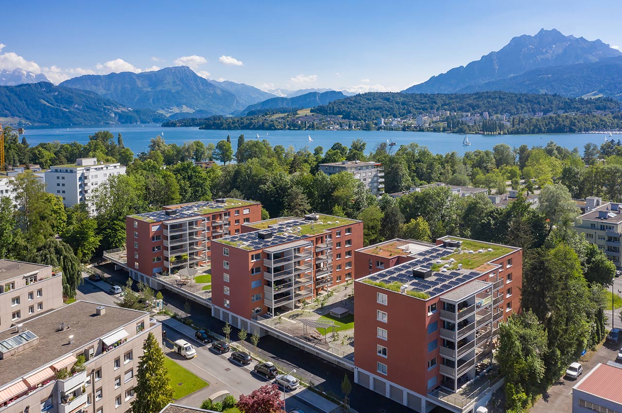Im Zuge der Nachverdichtung und energetischen Sanierung der 3 Gebäudehüllen, interpretiert das Farbkonzept die Wohnüberbauung im Luzerner Seefeld neu.