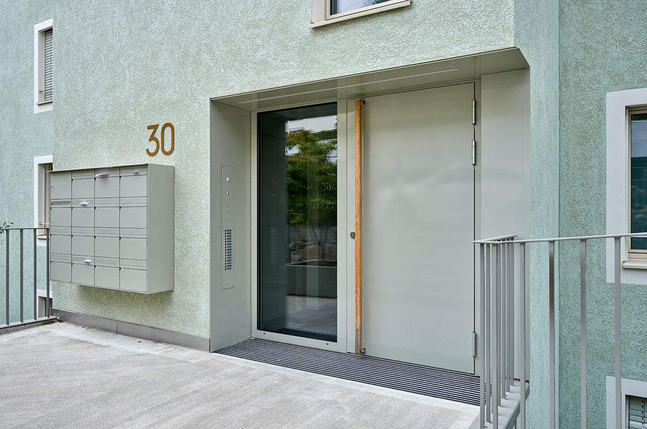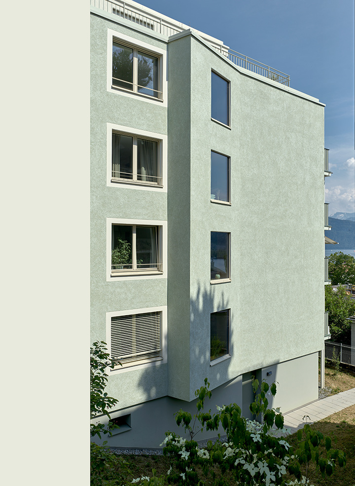 Im Zuge der energetischen Sanierung erfuhr die Gebäudehülle eine intensive Schuppenbehandlung. Die in die Jahre gekommene Kunstschieferhülle fiel dieser zum Opfer. Ferner wurde ein Dachaufbau und eine neue Balkonebene erstellt. Das Farbkonzept rehabilitiert die ursprüngliche Putztextur. Die subtile Farbgebung des granierten Oberputzes (Zweifarbigkeit), fügt sich sich einerseits in den Reigen der kontextuellen Farbwelt, andererseits ist sie ein Alleinstellungsmerkmal am dicht bebauten Luzerner Seerücken.